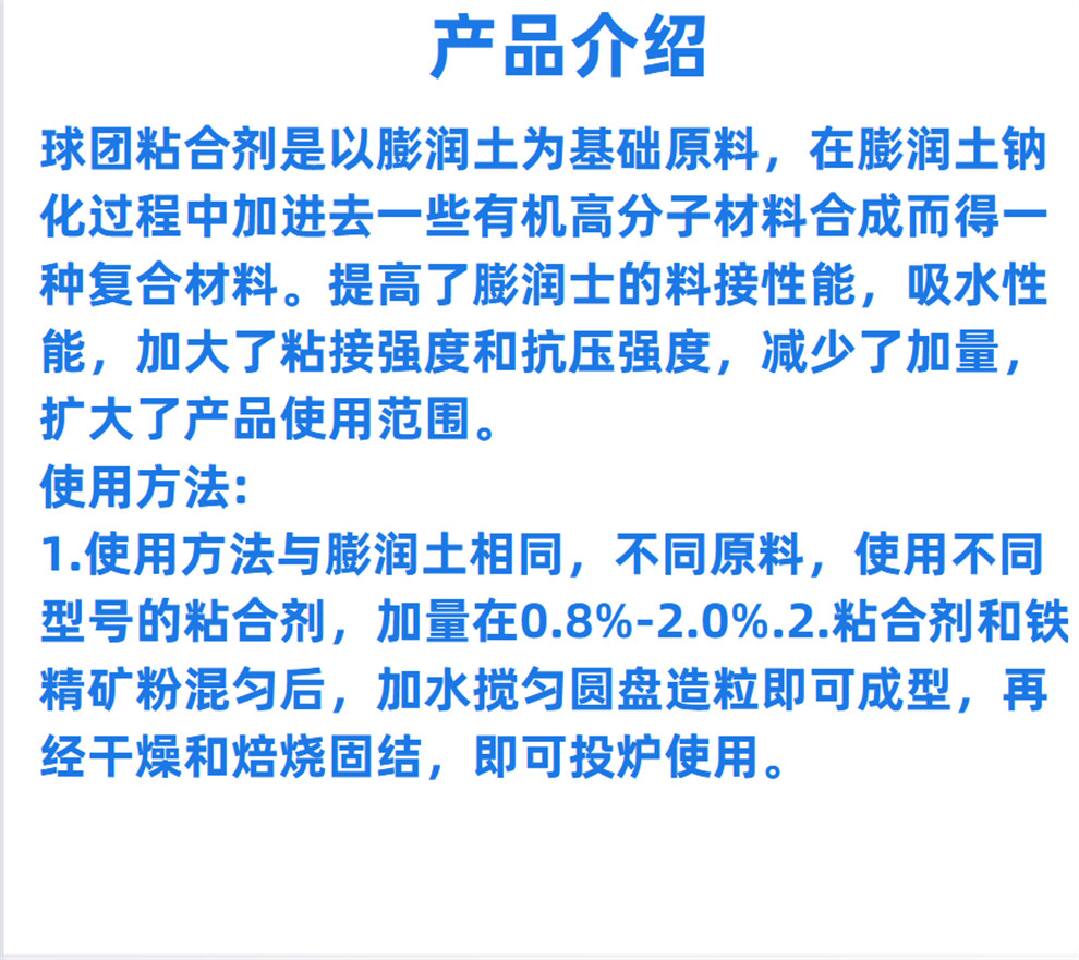 產(chǎn)品介紹:球團粘合劑是以膨潤土為基礎(chǔ)原料,在膨潤土鈉化過程中加進去一些有機高分子材料合成而得一種復(fù)合材料。提高了膨潤土的粘接性能、吸水性能,加大了粘接強度和抗壓強度,減少了加量,擴大了產(chǎn)品使用范圍。應(yīng)用范圍:應(yīng)用于各種鐵精粉球團礦造球。包裝及貯存:25k……