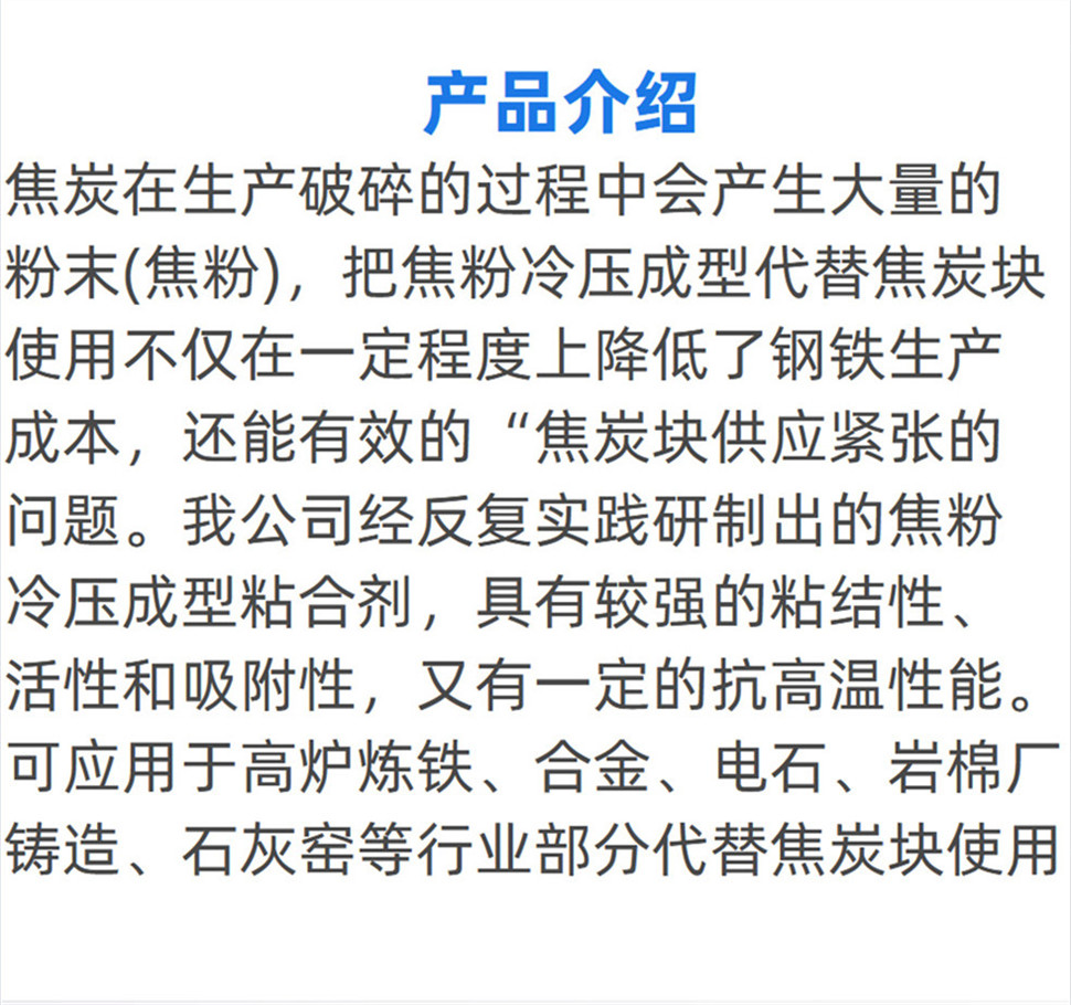產(chǎn)品介紹:焦炭在生產(chǎn)破碎的過程中會產(chǎn)生大量的粉末(焦粉),把焦粉冷壓成型代替焦炭塊使用不僅在一定程度上降低了鋼鐵生產(chǎn)成本,還能有效的*焦炭塊供應(yīng)緊張的問題。我公司經(jīng)反復(fù)實(shí)踐研制出的焦粉冷壓成型粘合劑,具有較強(qiáng)的粘結(jié)性、活性和吸附性,又有一定的抗高溫性能……
