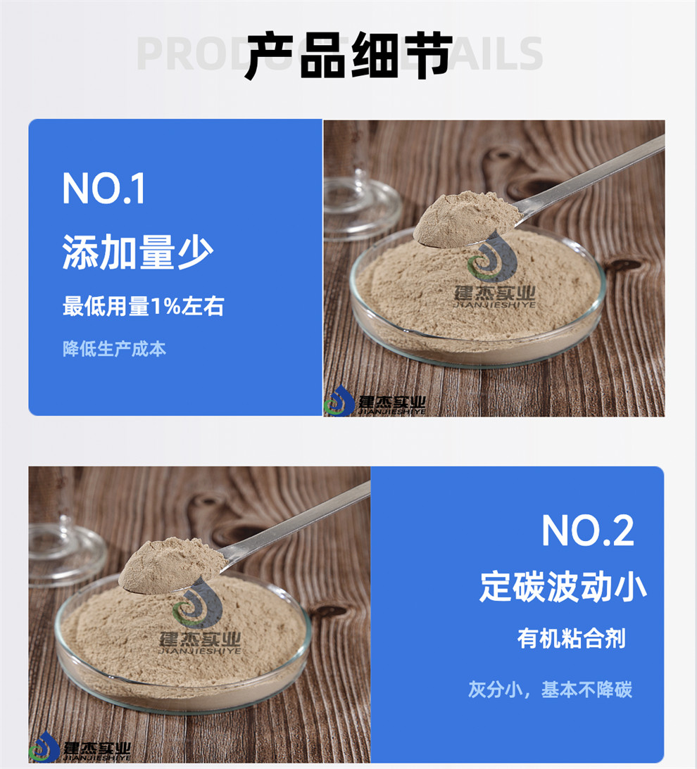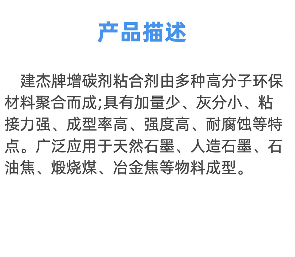 產(chǎn)品介紹:建杰牌增碳劑粘合劑由多種高分子環(huán)保材料聚合而成;具有加量少、灰分小、粘接力強、成型率高、強度高、耐腐蝕等特點。廣泛應(yīng)用于天然石墨、人造石墨、石油焦、煅燒煤、冶金焦等物料成型。產(chǎn)品特點:1.添加量少:*低用量1%左右,降低生產(chǎn)成本。2.固定碳波動小:有……